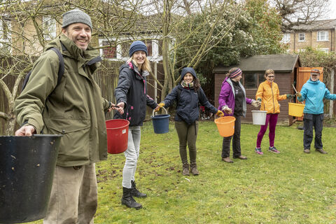 Group of smiling people holding buckets between each other.